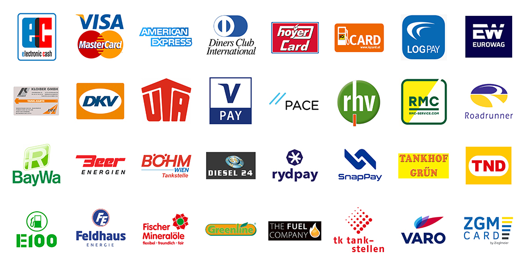 Neben ec-Karten und Kreditkarten (Mastercard, VISA, Diners, American Express) werden auch folgende Flottenkarten im Shop und an den Tankautomaten akzeptiert.