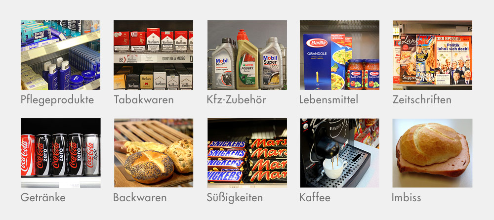 In unserem gut sortierten Tankstellenshop können Sie eine Vielzahl von Produkten zu fairen Preisen erwerben. Als Geschenkidee gibt es bei uns Gutscheine in der von Ihnen gewünschten Höhe, die immer gut ankommen. Unsere Backwaren beziehen wir täglich frisch von der ortsansässigen Bäckerei Kloiber, außerdem gibt es an der Imbisstheke immer frischen Leberkäse von lokalen Metzgereien.